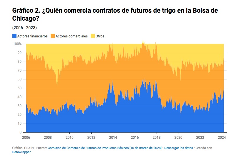 La volatilidad de los precios experimentada durante la crisis de 2007-2008 fue, en parte, el resultado de un aumento de la especulación financiera. De manera similar, cuando comenzó la guerra en Ucrania las inversiones en futuros de materias primas y en los fondos de inversión vinculados a éstas se dispararon. Las compras y ventas especulativas en el mercado del trigo en la Bolsa de París aumentaron de 35 millones de euros en enero de 2021 a 1000 millones de euros en marzo de 2022. Un informe del Panel Internacional de Expertos en Sistemas Alimentarios Sostenibles (IPES-Food por sus siglas en inglés) encontró que el precio del trigo en los mercados de futuros se incrementó de 54% en nueve días, mientras que la volatilidad fue un 20% más alta de lo normal según lo señalado por la Comisión de Comercio de Futuros de Materias Primas de Estados Unidos. Y si bien esto impulsó alzas en los precios que castigaron directamente a las personas consumidoras, los fondos de cobertura y los fondos de pensiones que especularon en los mercados de alimentos obtuvieron enormes ganancias.