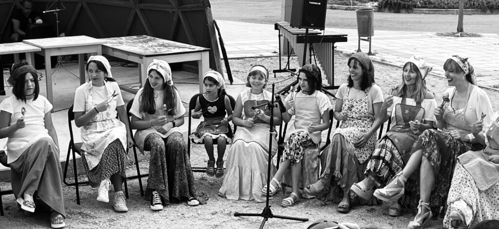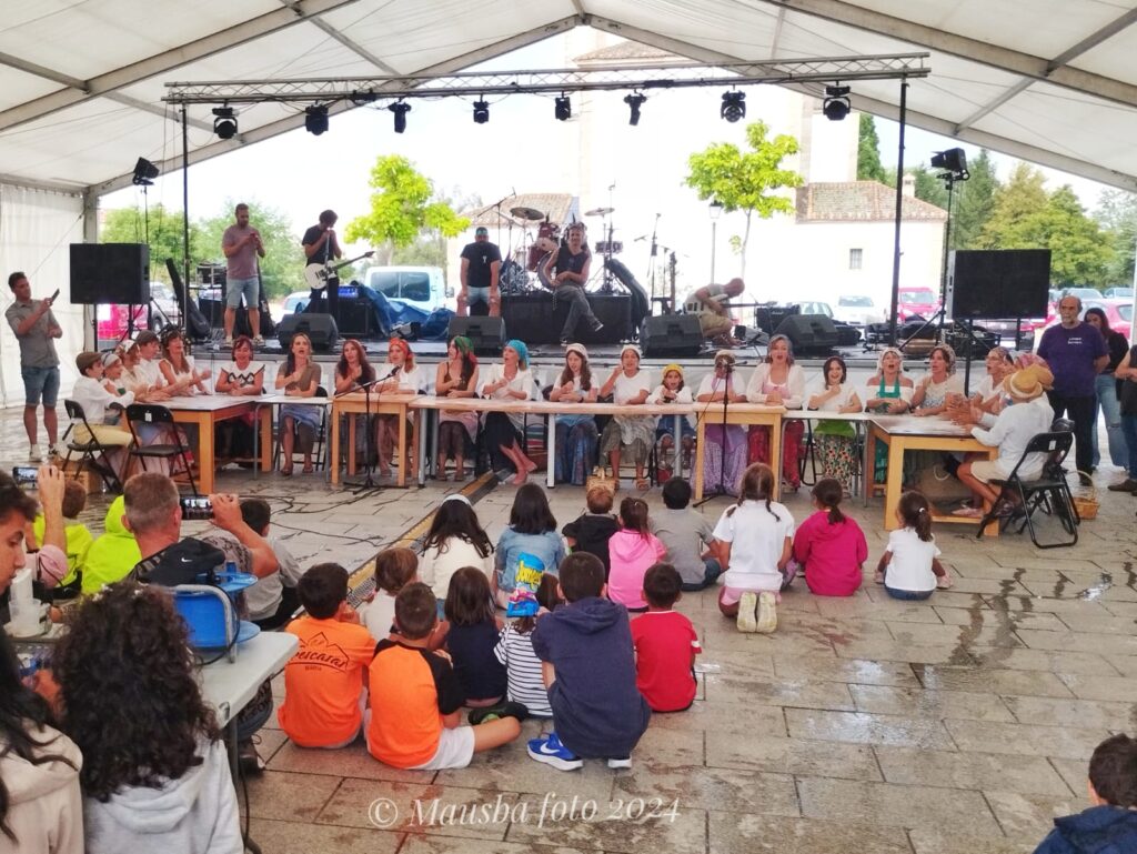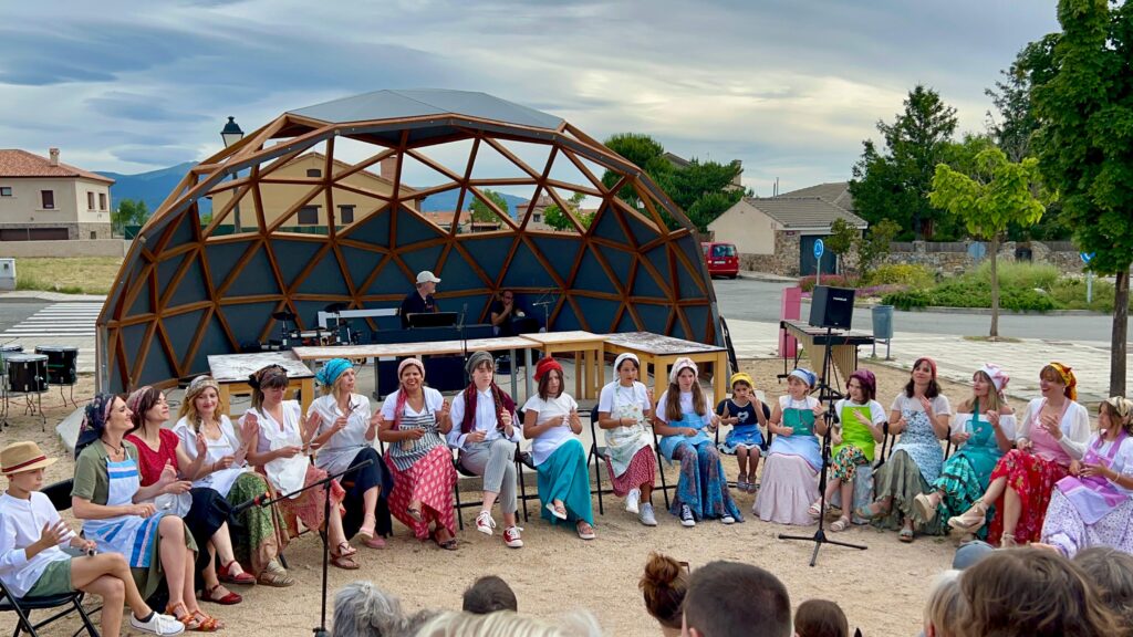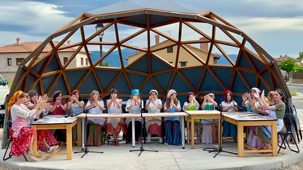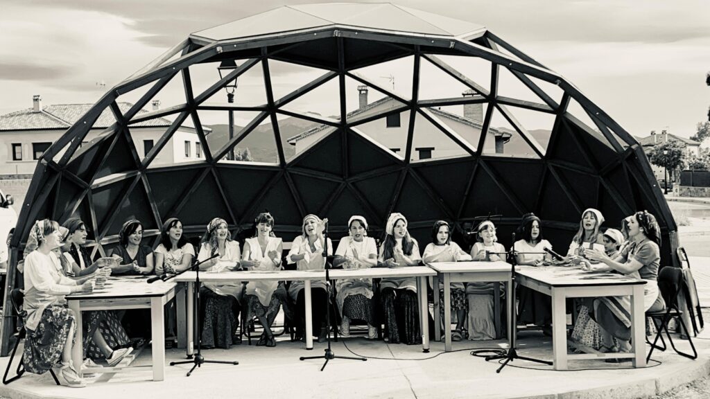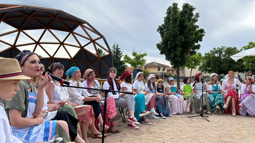 Fátima Martín.- En la segoviana Trescasas, histórica tierra de serranas, se está cociendo algo con mucha miga: Un proyecto de música tradicional acompañada con instrumentos de cocina por parte de las mujeres del pueblo y sus hija/os. Interpretan los llamados ritmos de Panaderas, entre otras canciones de transmisión oral, con útiles como cucharas, morteros, almireces, botellas de anís, castañuelas, conchas, carajillos, panderetas, hueseras y, por supuesto, con las manos en la mesa y en la masa acompasando la propia voz. Se aglutinan alrededor de la asociación cultural Masamadre, cuyo nombre no puede estar más sembrado. Ya han actuado en el pueblo el Día de la Música y en el II Cambrones Fest, enmarcado en la Semana Cultural y las Fiestas Patronales de la localidad. FemeninoRural tuvo el privilegio de entrevistarlas durante uno de los ensayos en la Biblioteca Municipal. (Imagen destacada: Mausba foto 2024)