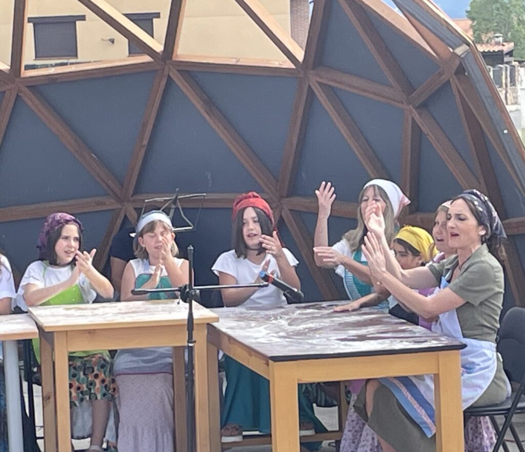 ¿Cómo se formó esta Masamadre? , con motivo del pasado Día de la Música, desde Cultura se quería lanzar para el pueblo un taller gratuito de folklore trabajando con instrumentos tradicionales y de cocina. Y se pusieron manos a la obra. Dan forma a este proyecto una veintena de vecinas/os del pueblo. Las adultas son todas mujeres y casi todas madres. “¿Qué ha pasado? Que la/os hija/os se han sumado. De modo que hay niña/os desde los 9 a los 15 años. Hombres adultos no hay, pero la actividad está abierta a toda/os. Echamos de menos a algún hombre y a alguna abuela. Llegar a las tres generaciones sería maravilloso. Masamadre es la mejor masa de la que sale el pan. Somos madres e hija/os. Queremos que perviva nuestra memoria, como una semilla, y que cuando ella/os sean abuela/os, se lo canten a sus nieta/os para perpetuar la tradición”, comenta Beatriz, para quien “lo más bonito es que es una actividad intergeneracional”.